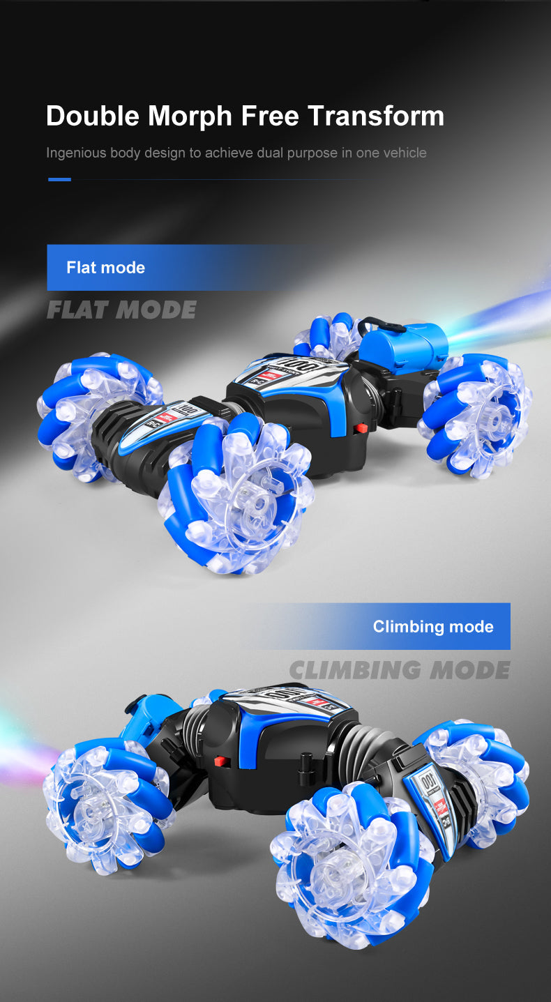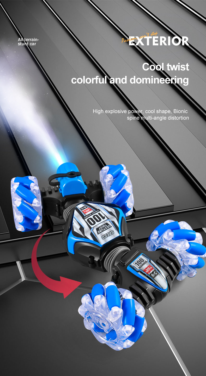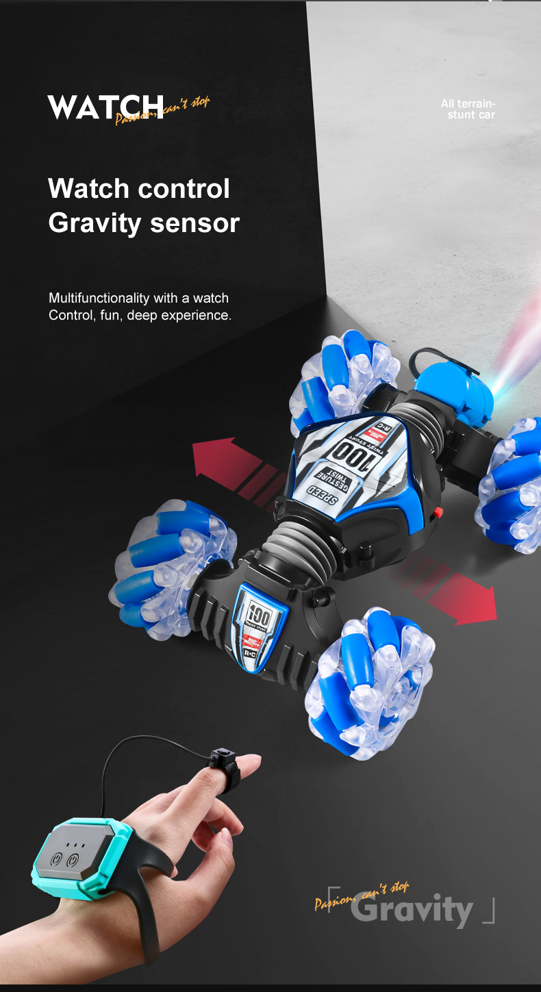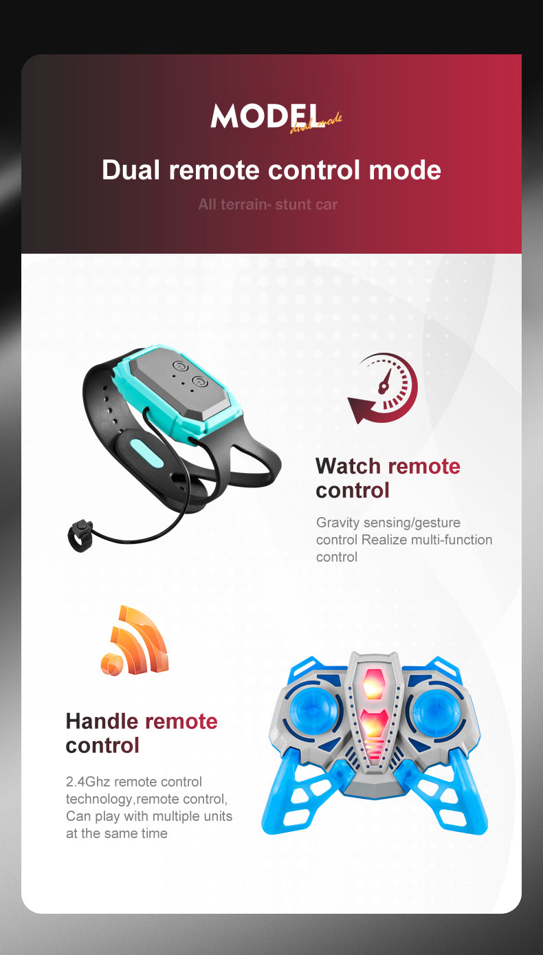 Gesture Sensing Twist and Remote Control. You can gesture control stunt twist car. You just need to wear a gesture-sensing watch and give a gesture, and the remote control car will act accordingly. Or you can control it directly via the remote control.(The two kinds of remote can not turn on at the same time)